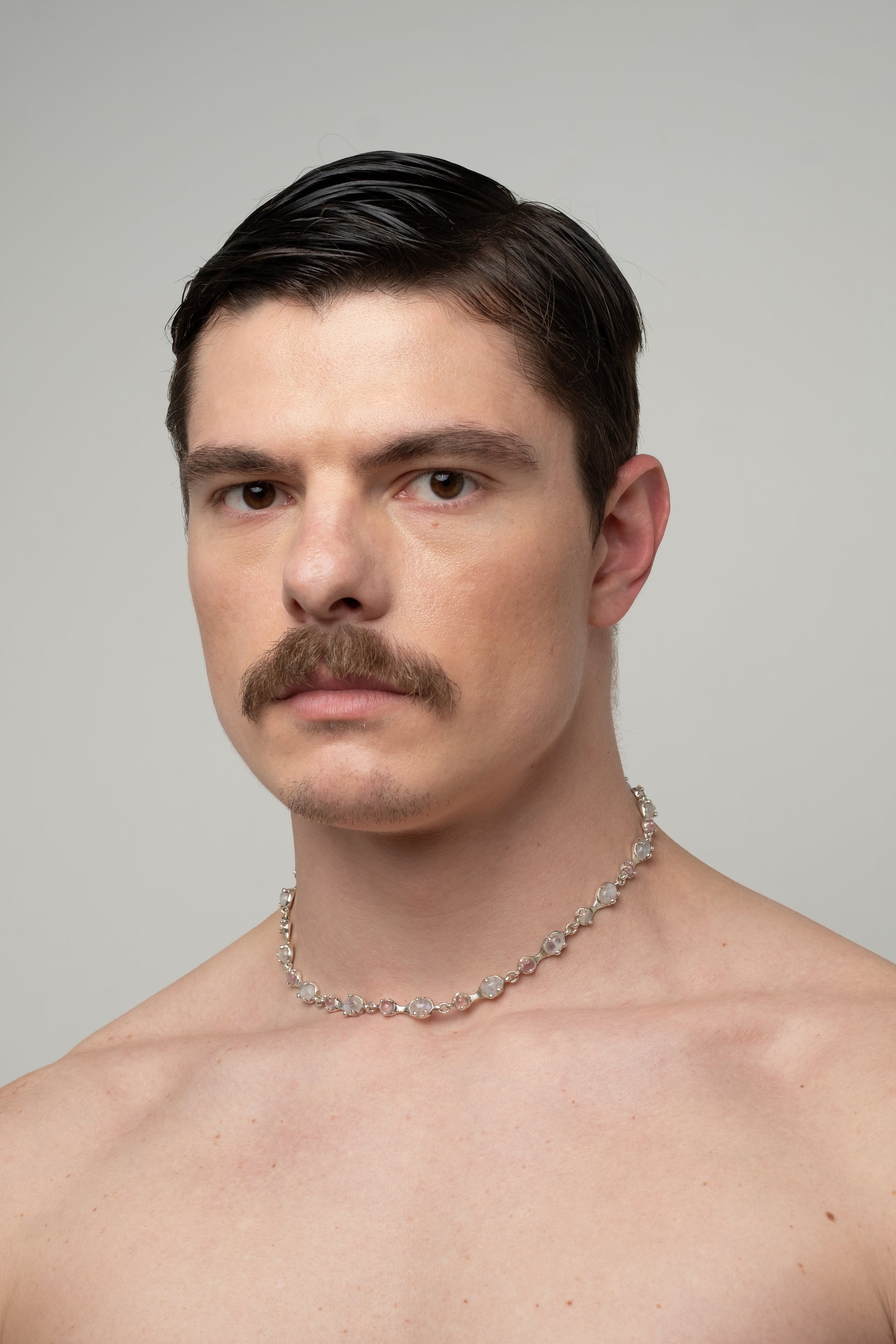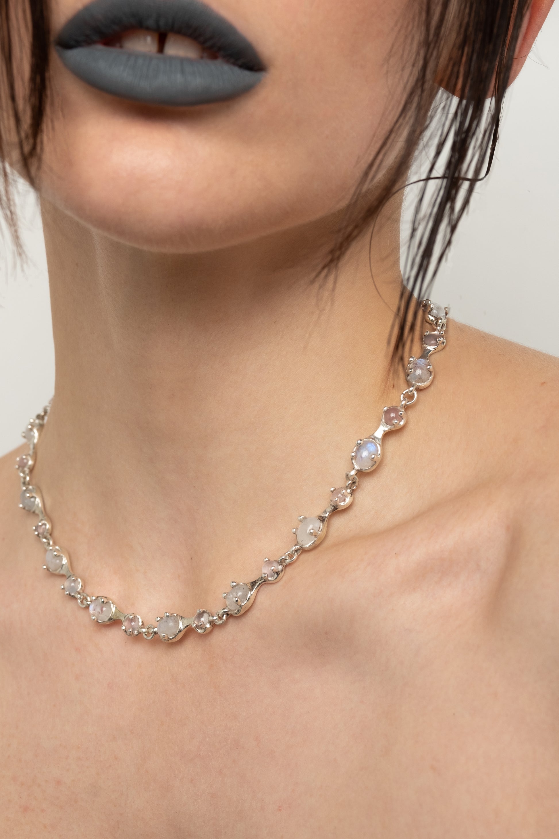 Кольє Moon Honey з місячним камінням та рожевим кварцом в оправі зі срібла. Важке й текуче, мов мед, воно огортає 18 натуральних каменів — виразне, яскраве й водночас лаконічно-класичне.