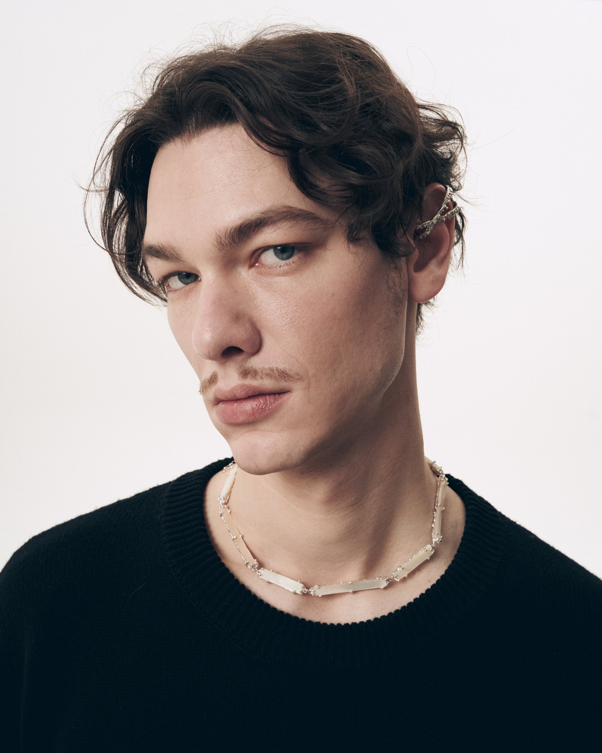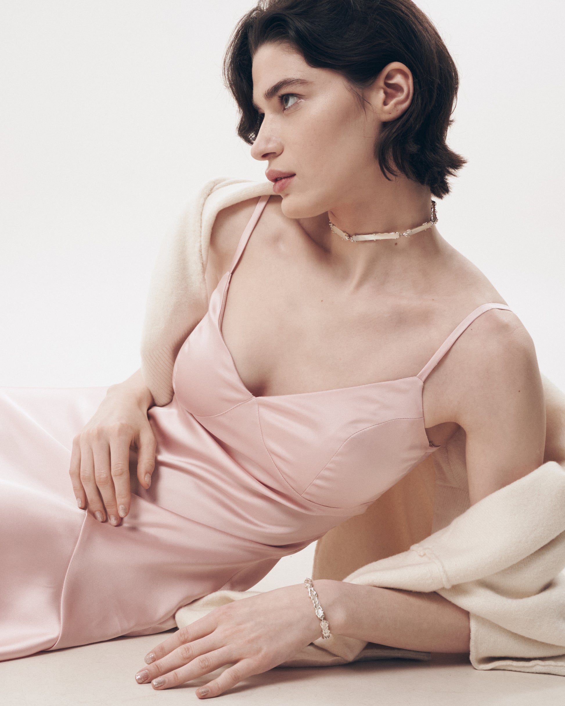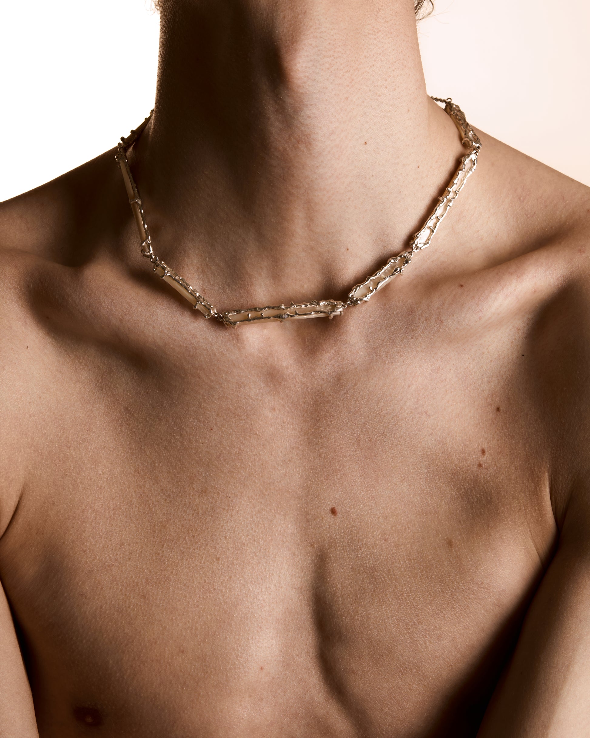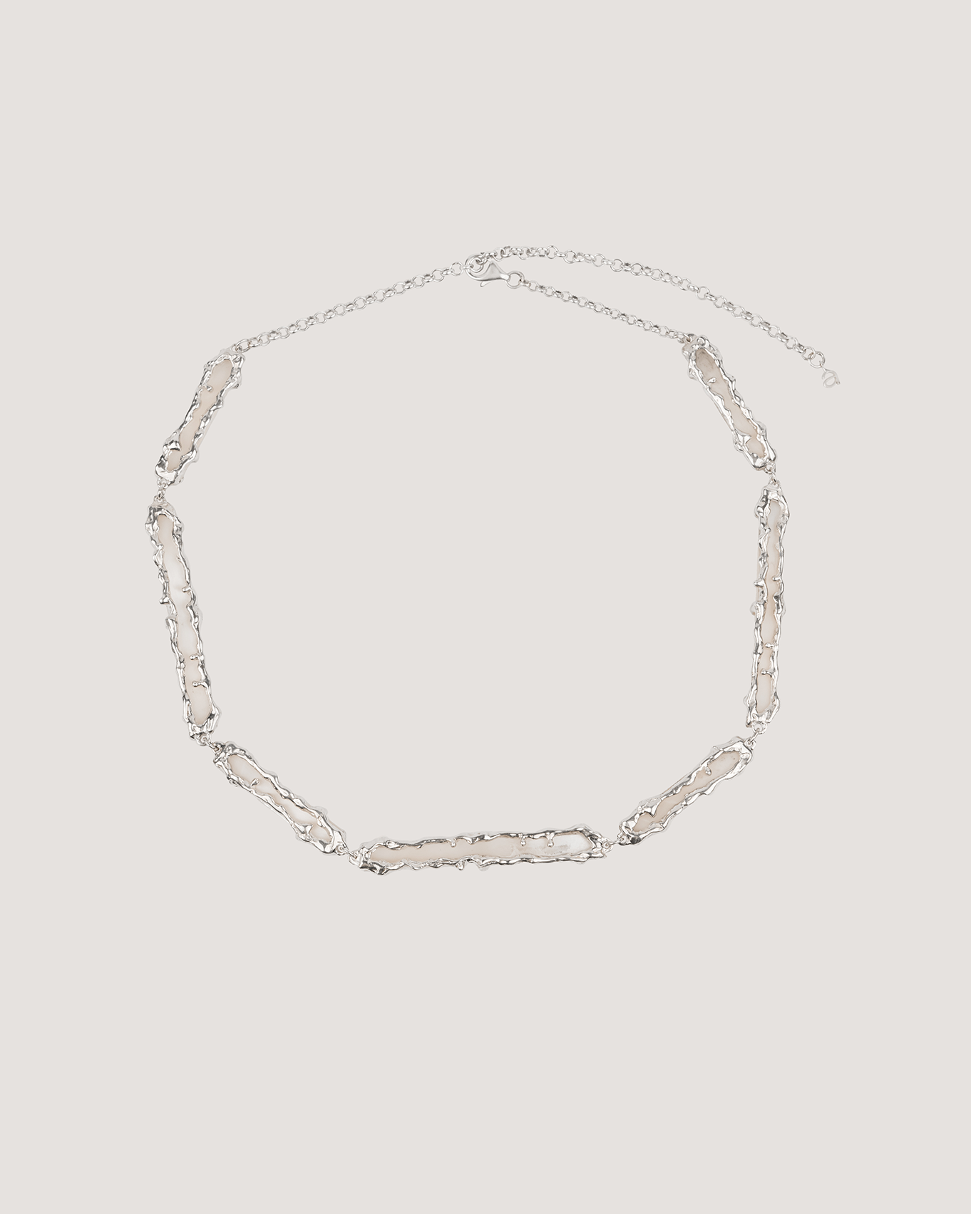 Одним із основних принципів á propos є функціональність прикрас. Тому це кольє  має дві відмінні за дизайном сторони. Сторона з потьоками срібла і сторона де майже лише перламутр.