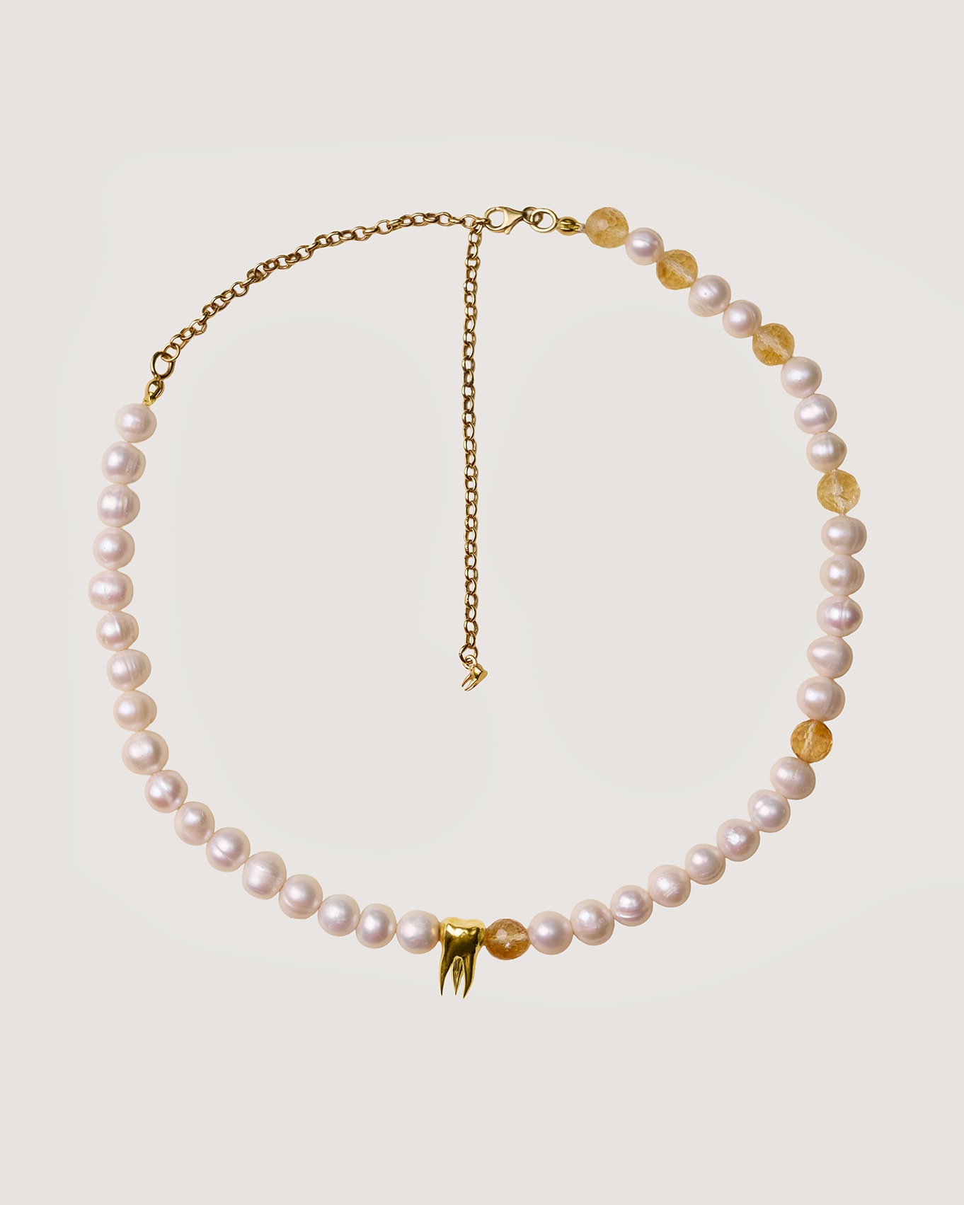 В колекції перлів 'Show me your teeth' ми об'єднали два символи - ніжність перлів та міць зуба. Краса цих прикрас лежить в простоті та величі кожної перлини, що магічно доповнюється агресивною формою зуба. Кожен перл є неповторним твором природи, а зуб символізує нашу індивідуальність і силу.