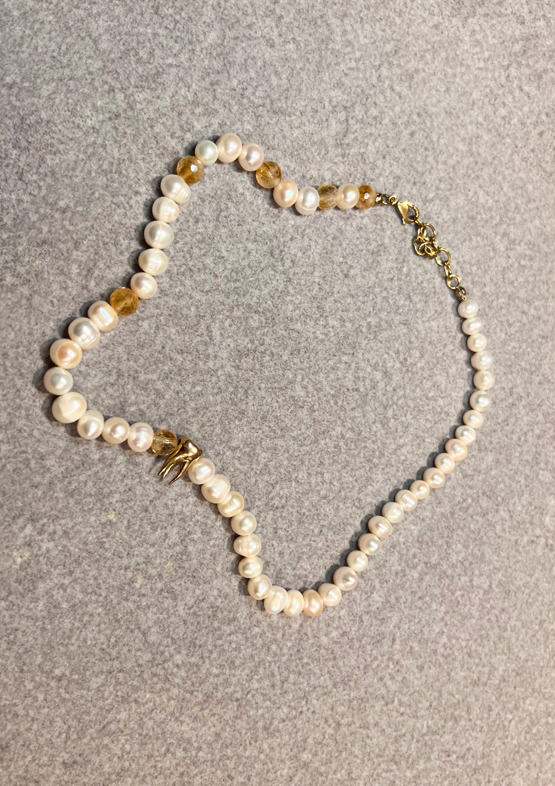 Білі перли, з цитриновими намистинами, фурнітура, зуб - срібло в позолоті.