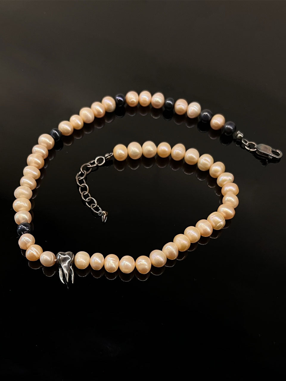 В колекції перлів 'Show me your teeth' ми об'єднали два символи - ніжність перлів та міць зуба. Краса цих прикрас лежить в простоті та величі кожної перлини, що магічно доповнюється агресивною формою зуба. Кожен перл є неповторним твором природи, а зуб символізує нашу індивідуальність і силу.