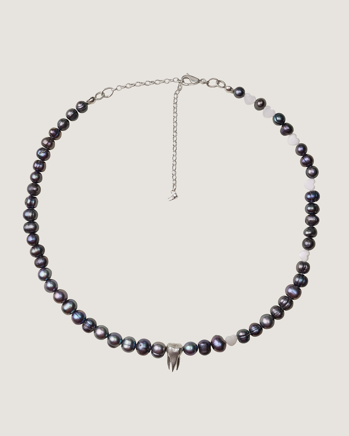 В колекції перлів 'Show me your teeth' ми об'єднали два символи - ніжність перлів та міць зуба. Краса цих прикрас лежить в простоті та величі кожної перлини, що магічно доповнюється агресивною формою зуба. Кожен перл є неповторним твором природи, а зуб символізує нашу індивідуальність і силу.