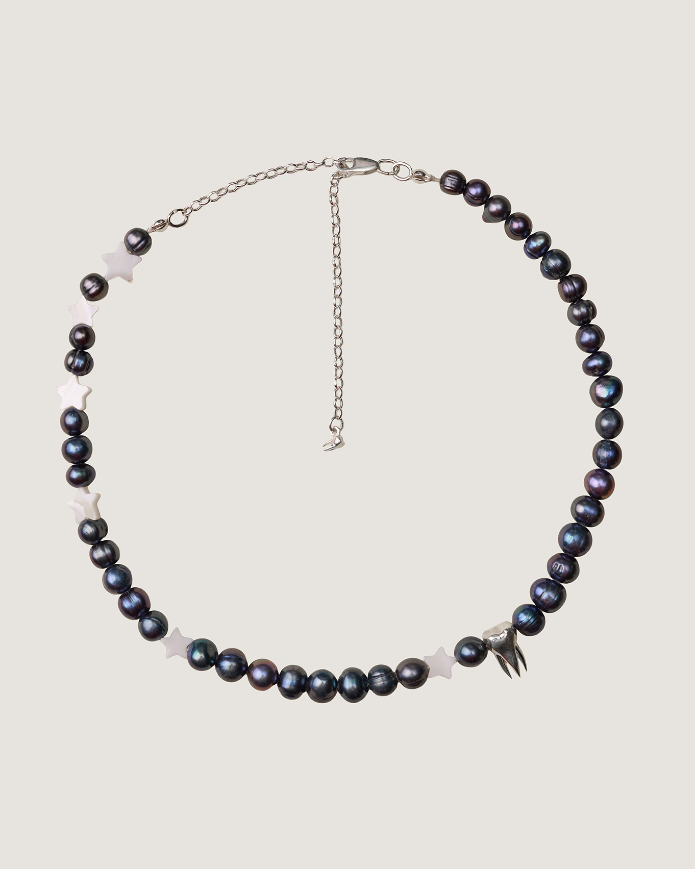 Чорні морські перли, з перламутровими зірками, фурнітура, зуб - срібло