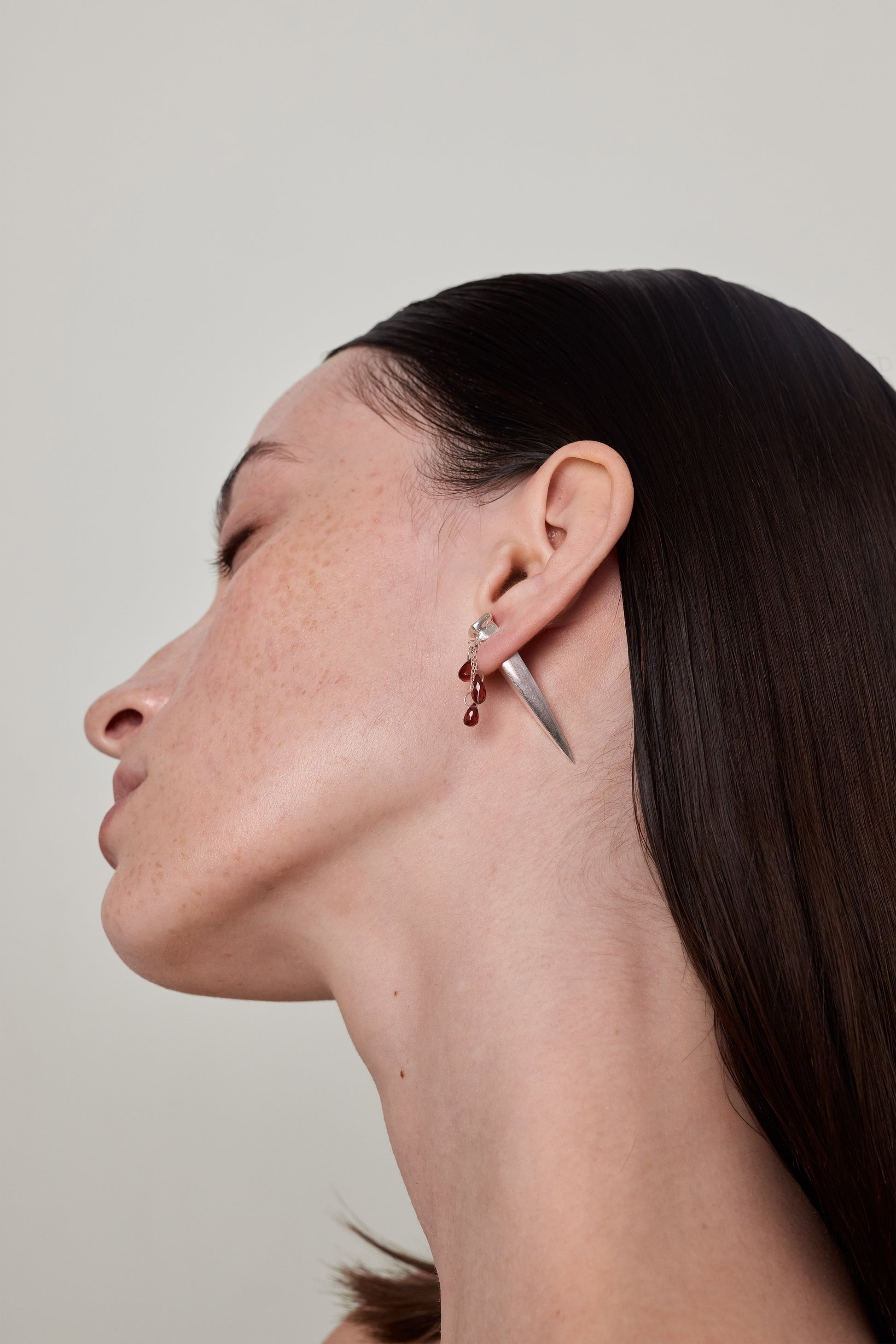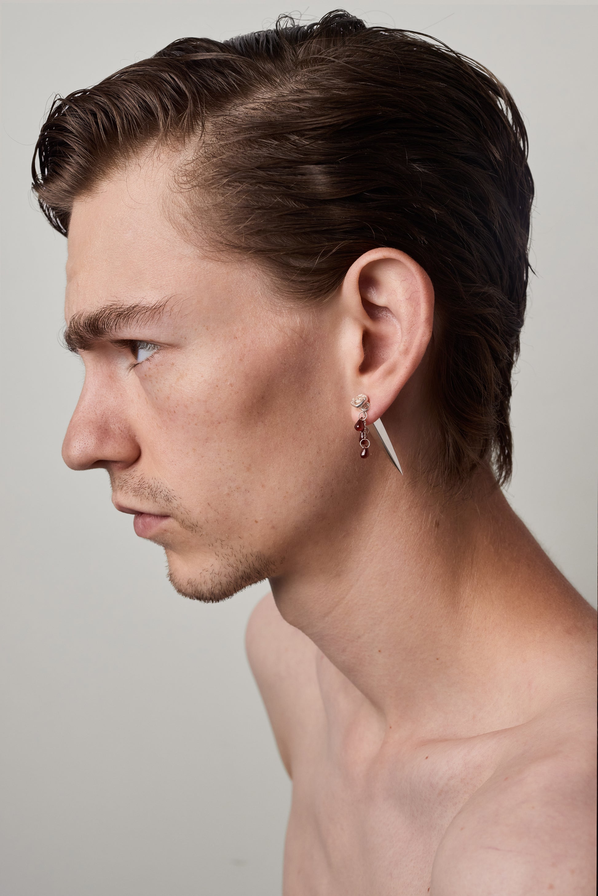 Масивний гвіздок, що проходить крізь вухо, створюючи сміливий і провокативний акцент. З нього спускаються краплини червоного гранату — акцент, який нагадує про силу та індивідуальність. Сережка поєднує мінімалістичну форму і масивність, роблячи образ одночасно авангардним і впізнаваним.